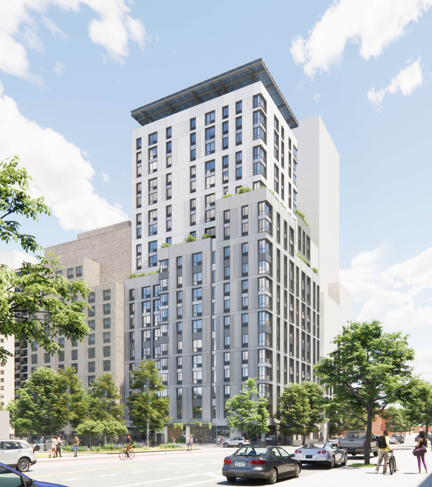 The first building in a planned two-phased development, 1931 Lafayette – North Tower will offer 228 units of supportive and affordable housing in the Bronx. The 22-story building by Gilbane Development Company with Strada Ventures and Center for Urban Community Services (CUCS) has offices and program space for social services along with a variety of indoor and outdoor amenity areas, including a children’s playroom, laundry room, conference room, fitness room, community room, and two landscaped terraces with integrated wooden seating and planters filled with native species. Designed by Magnusson Architecture and Planning (MAP), the all-electric building will be Passive House certified and feature a prefabricated exterior wall system, triple-pane uPVC windows, unitized packaged terminal heat pumps (PTHPs), and green roofs. The development is clad in a panelized façade system that intersperses shades of gray and white to lighten the building’s appearance, and setbacks mitigate the impact of its height. Two floors of glazing wrap the program space, engaging the streetscape at the corner of Lafayette and Turnbull, and a glassy entry creates a welcoming connection to the sidewalk.