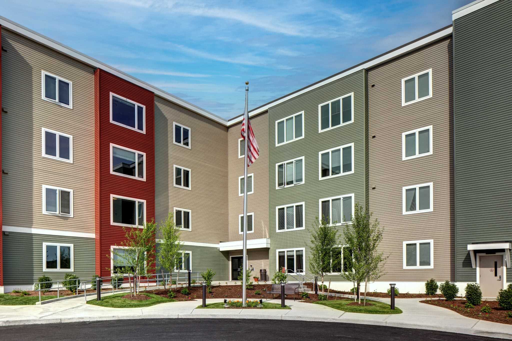 35 Broadway in Menands, NY, is a $26 million, 67-unit affordable housing community for households earning up to 60% of AMI, with 35 homes dedicated to veterans who have or are experiencing homelessness. The all-electric building includes a mix of one- and two-bedroom layouts designed with open floor plans and sustainable features such as high-efficiency heat pumps, energy recovery ventilation, and Energy Star appliances. Thoughtfully designed outdoor spaces include a community garden, landscaped seating areas, EV charging stations, and a contemplation garden with a columbarium to honor veterans who pass on without family. The development was made possible through a wide range of funding partners, including $15 million in equity from Federal and State Low-Income Housing Tax Credits, $4.9 million from New York State Housing and Community Renewal’s (HCR) Supportive Housing Opportunity Program, $368,500 from New York State Energy Research and Development Authority’s (NYSERDA) Clean Energy Initiative, $3.7 million in permanent financing from the Community Preservation Corporation, and $875,000 in annual ESSHI subsidy through NYS Office of Temporary and Disability Assistance (OTDA).