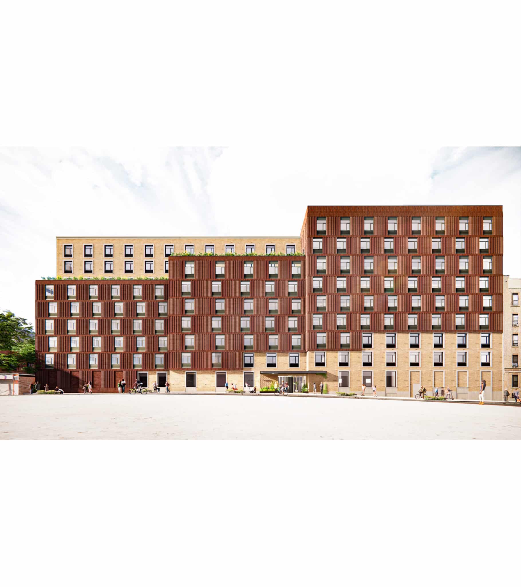 Rather than replicate the modest scale of surrounding blocks, the 9-story building echoes the church’s monumental presence in the neighborhood. The textured brick façade uses commonly available brick in a dynamic expression, bringing visual richness while retaining affordability. Setback terraces and green space at ground level offer a welcoming, neighborhood-scale transition that encourages local interaction and gathering.