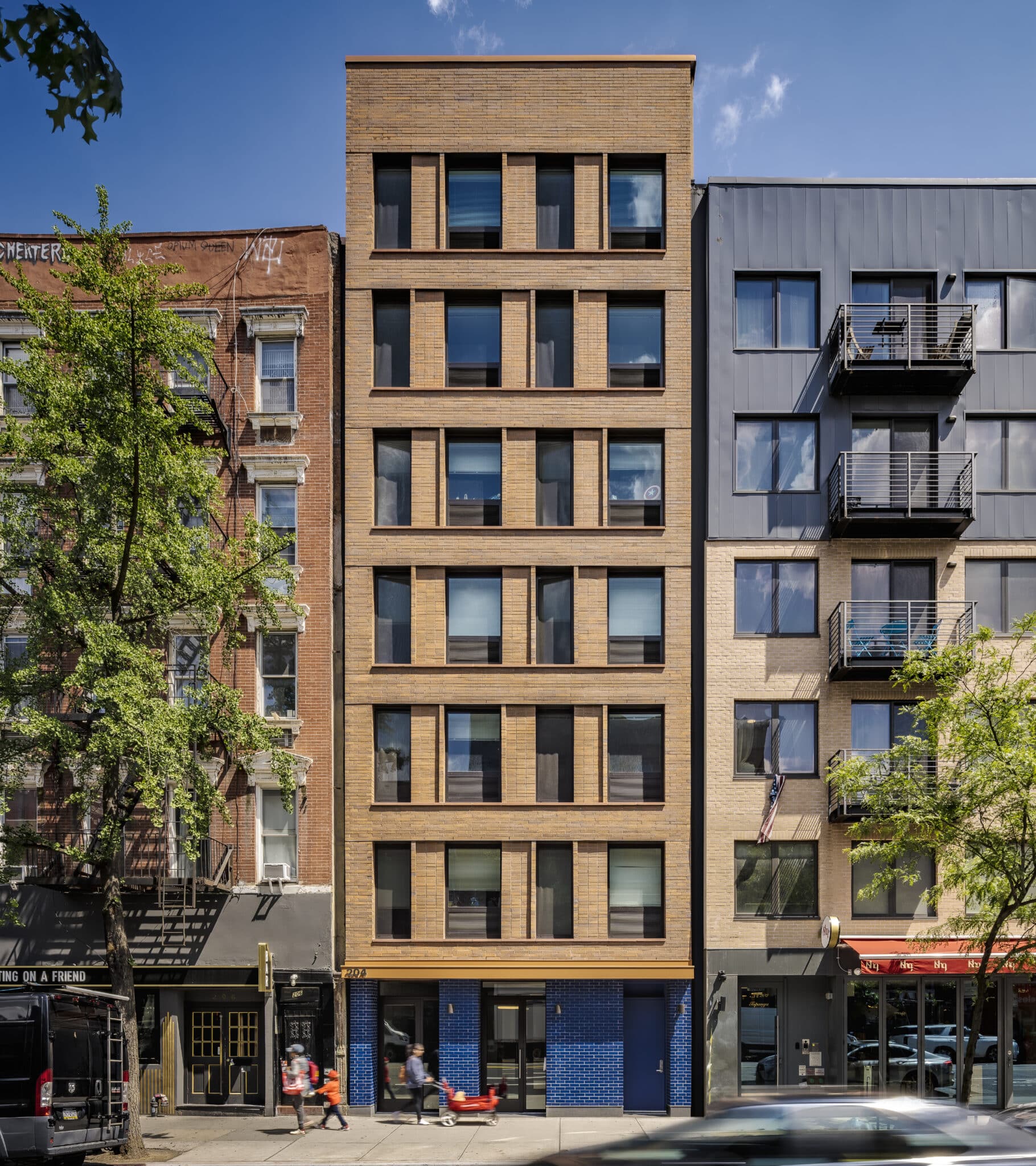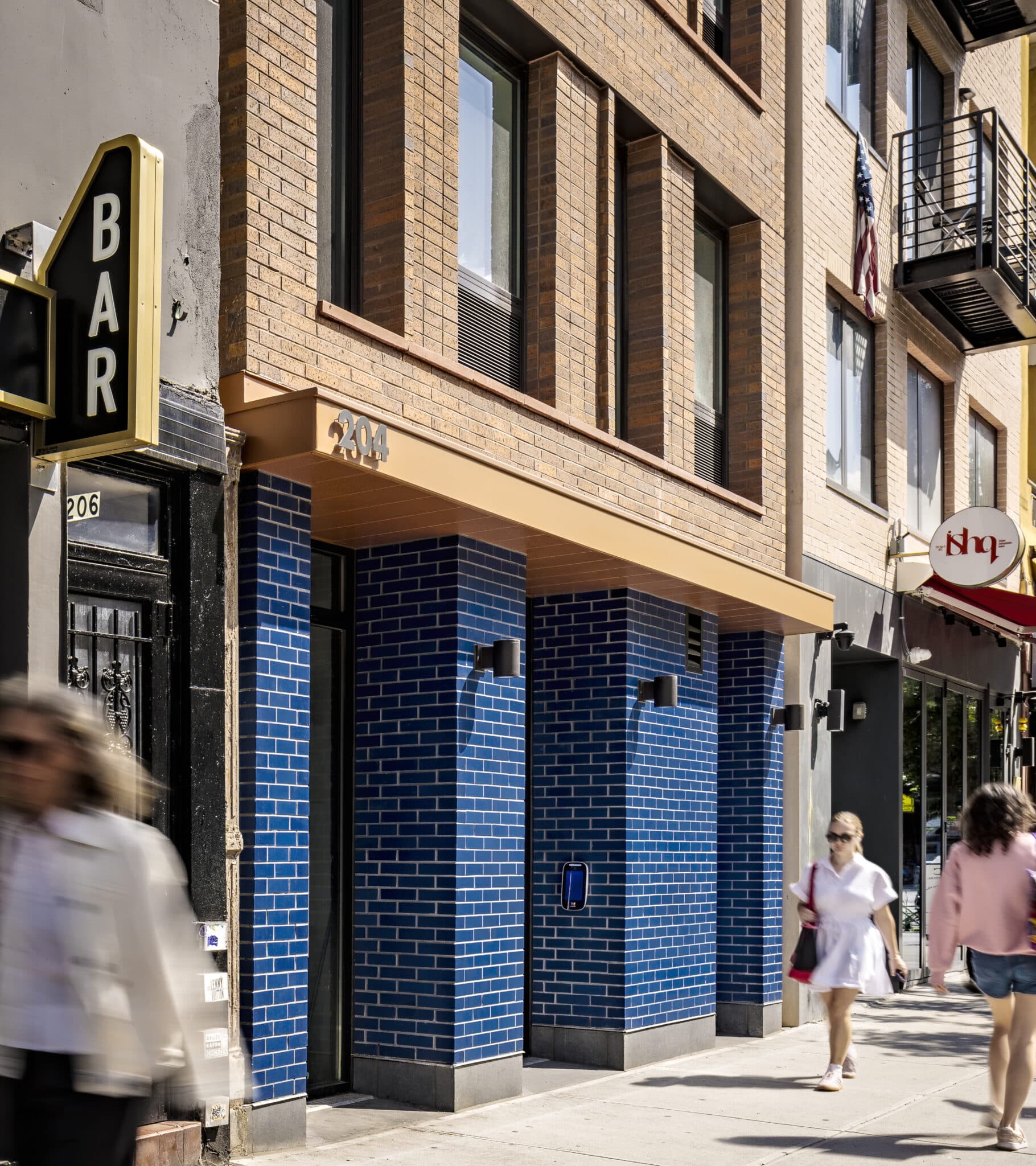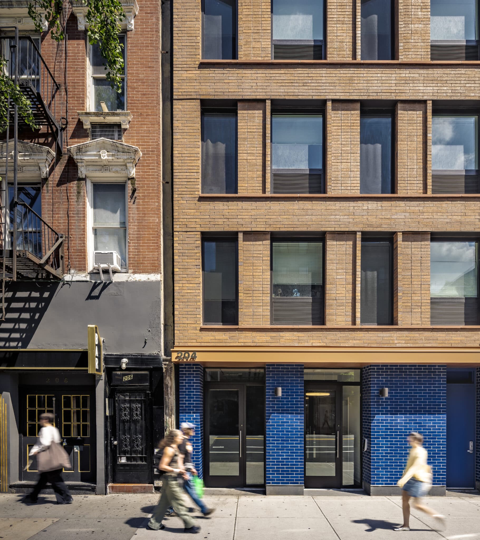 204 Avenue A, a new residential building in the East Village, adds ten income-restricted apartments and a ground-floor commercial space to a once-abandoned site in the middle of a busy commercial block. The property is located on a narrow interior lot between East 12th and East 13th streets, replacing a condemned structure that had been City-owned since the 1970s with a new building that meets current as-of-right zoning. To promote home ownership in the East Village, a portion of the new building’s ten units will be offered first to the former residents of the previous structure. The seven-story building features elegant terracotta-colored brick patterns and a grid of tall rectangular windows, on its upper floors, forming a cohesive, yet expressive addition to the existing street wall, and referencing traditional masonry patterns and details. Beneath a copper-colored metal trim, blue glazed bricks animate the building’s streel level façade and reflect the energy of the busy commercial thoroughfare. The building’s programming contains a mix of one- and two-bedroom apartments, each intended to maximize comfort and functionality despite the constraints of the narrow site plan.