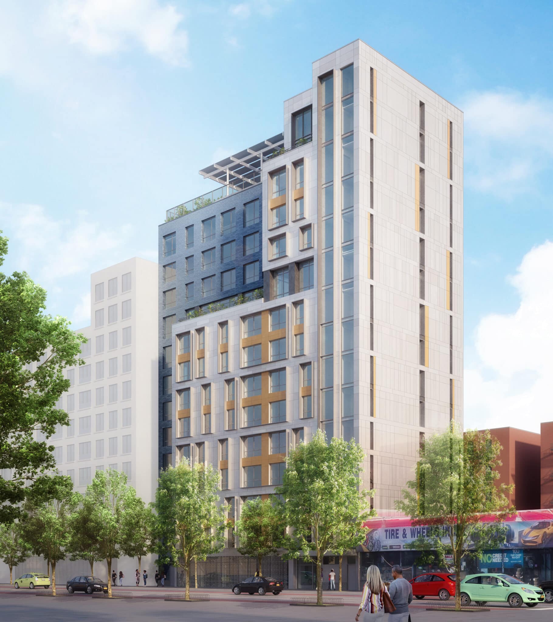 Developed by New Destiny Housing Corporation and designed by Magnusson Architecture and Planning, McLean Place will be a 72-unit, 14-story Passive House-certified building that will provide affordable and supportive apartments to low-income families and formerly homeless survivors of domestic violence. The all-electric development features numerous sustainability measures including a VRF system, energy recovery ventilators, and a rooftop photovoltaic array that powers common areas. Amenities include a lounge, fitness room, laundry room, multipurpose room, landscaped roof terrace, and community room that opens out to a rear yard. Native deciduous trees shade the courtyard, fitted with assorted seating and artificial turf to accommodate exercise, social interaction, and play for people of all ages and abilities. The terrace offers a more intimate experience, featuring built-in timber seating and tables perfect for small groups and independent leisure alike. The building is clad in light gray and copper-colored porcelain panels mixed with dark brick for visual interest, and boxes around windows help mitigate solar heat gain while distinguishing the façade with depth and shadow.