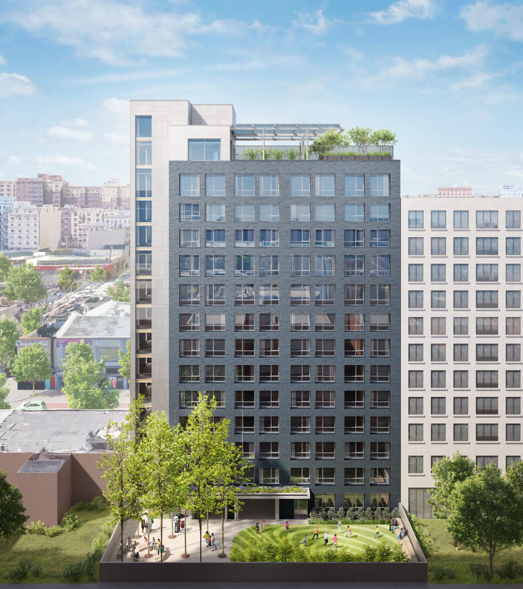 Domestic violence is the number one reason for family homelessness in New York City, but far too few supportive housing options exist for survivors who need both the housing and support to find long-term stability. McLean Place will provide 43 homes for families who fled from violence, where they will access the support and resources they need to overcome the long-lasting effects of abuse. Onsite program offices accommodate supportive services that help residents maintain housing stability and address trauma, while a variety of indoor and outdoor shared spaces encourage community and provide access to nature. On the roof terrace, ADA-accessible garden beds provide space for residents to grow vegetables, supporting healthy and hands-on shared activities. The lobby design creates a visual connection between the entrance and rear yard, drawing people in and encouraging use of the outdoor area. Planted green roofs topmost setback floors, a biophilic design element that reduces runoff and adds lush, natural accents, contributing to a serene living environment.
