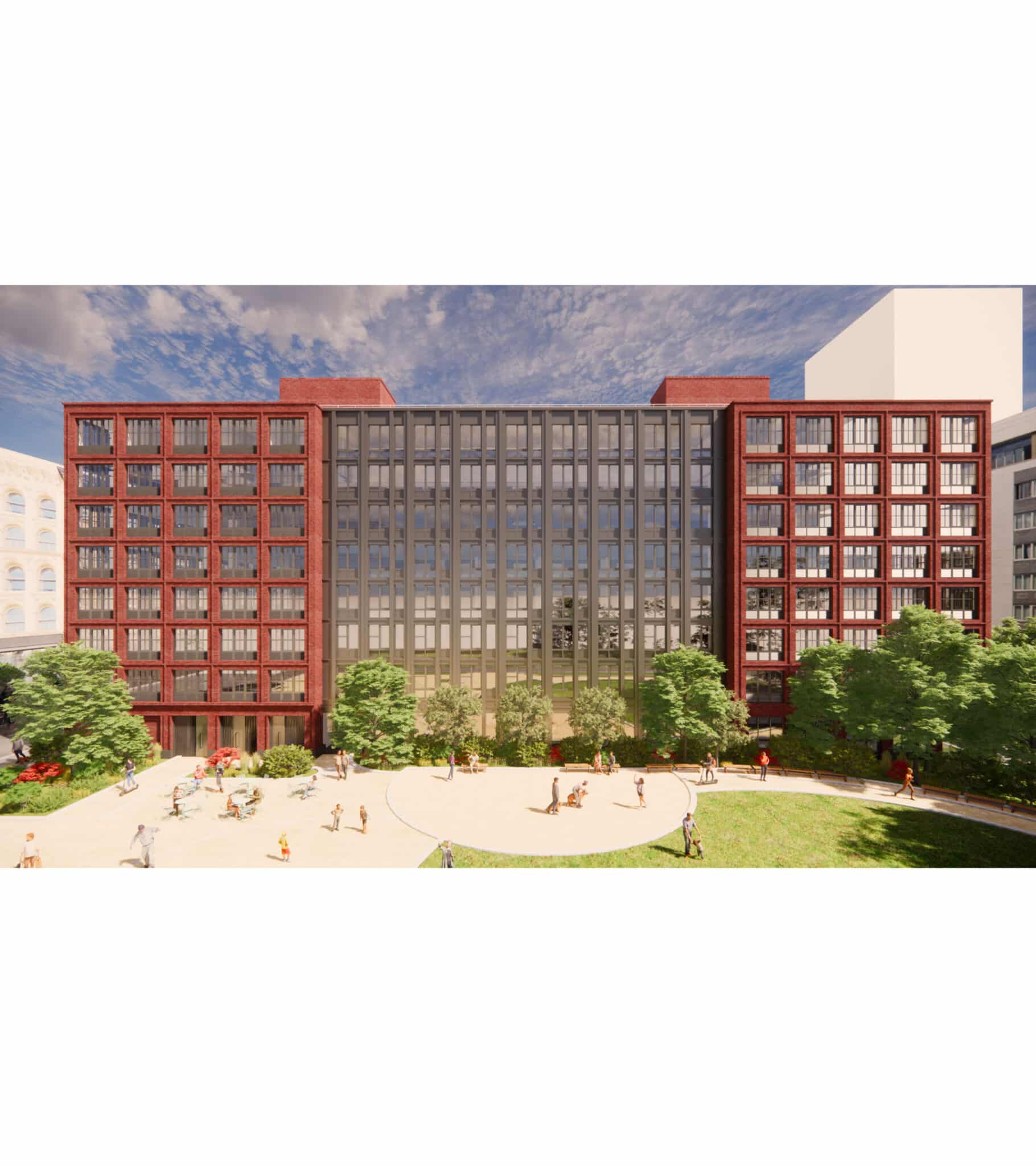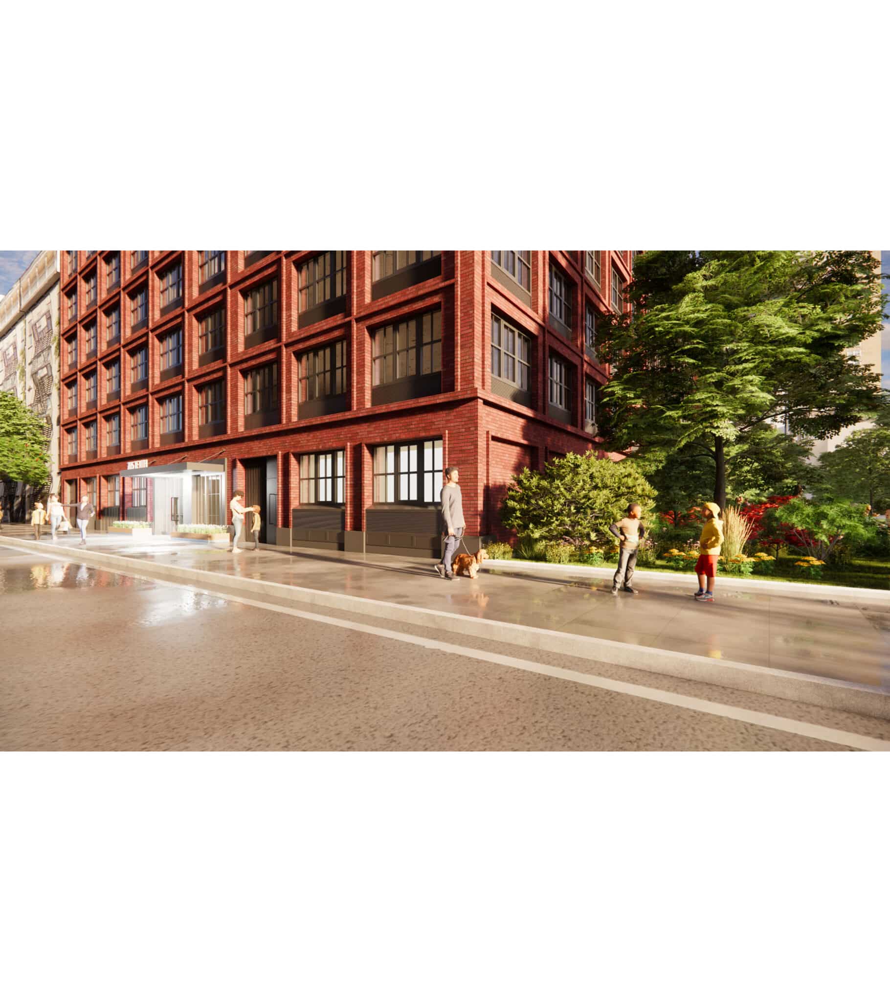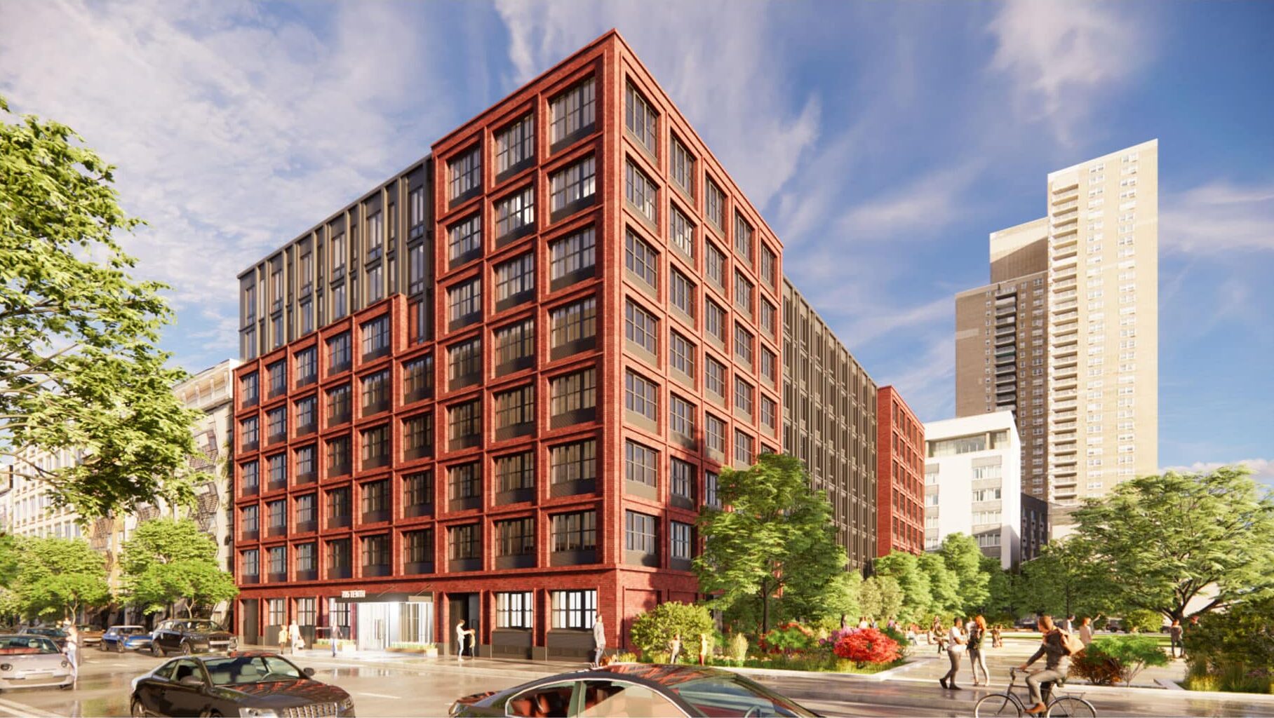 Developed in partnership with Douglaston Development and Actors Fund Housing Development Corporation, the eight-story building brings new housing to Hell’s Kitchen that specially addresses the needs of its artistic and performing arts community. The façade is inspired by the surrounding loft-style industrial architecture and uses a mix of exposed brick, metal cladding, and expansive glass windows, chosen to bring maximum daylight into the building. Adjacent to the building is a new public green space, developed and managed through a partnership with NYC Parks.