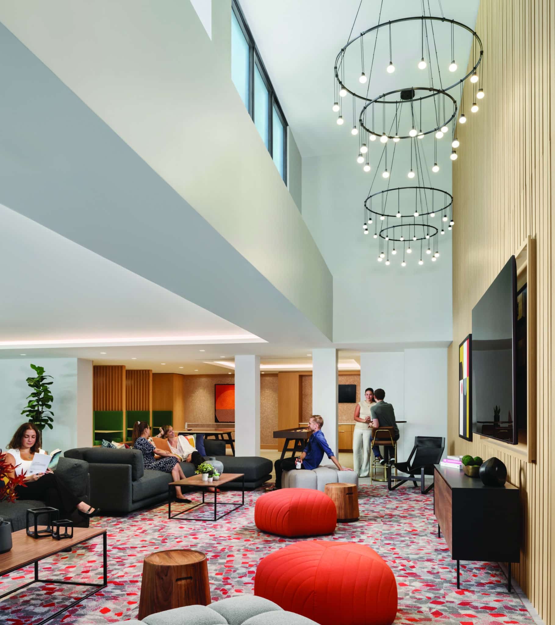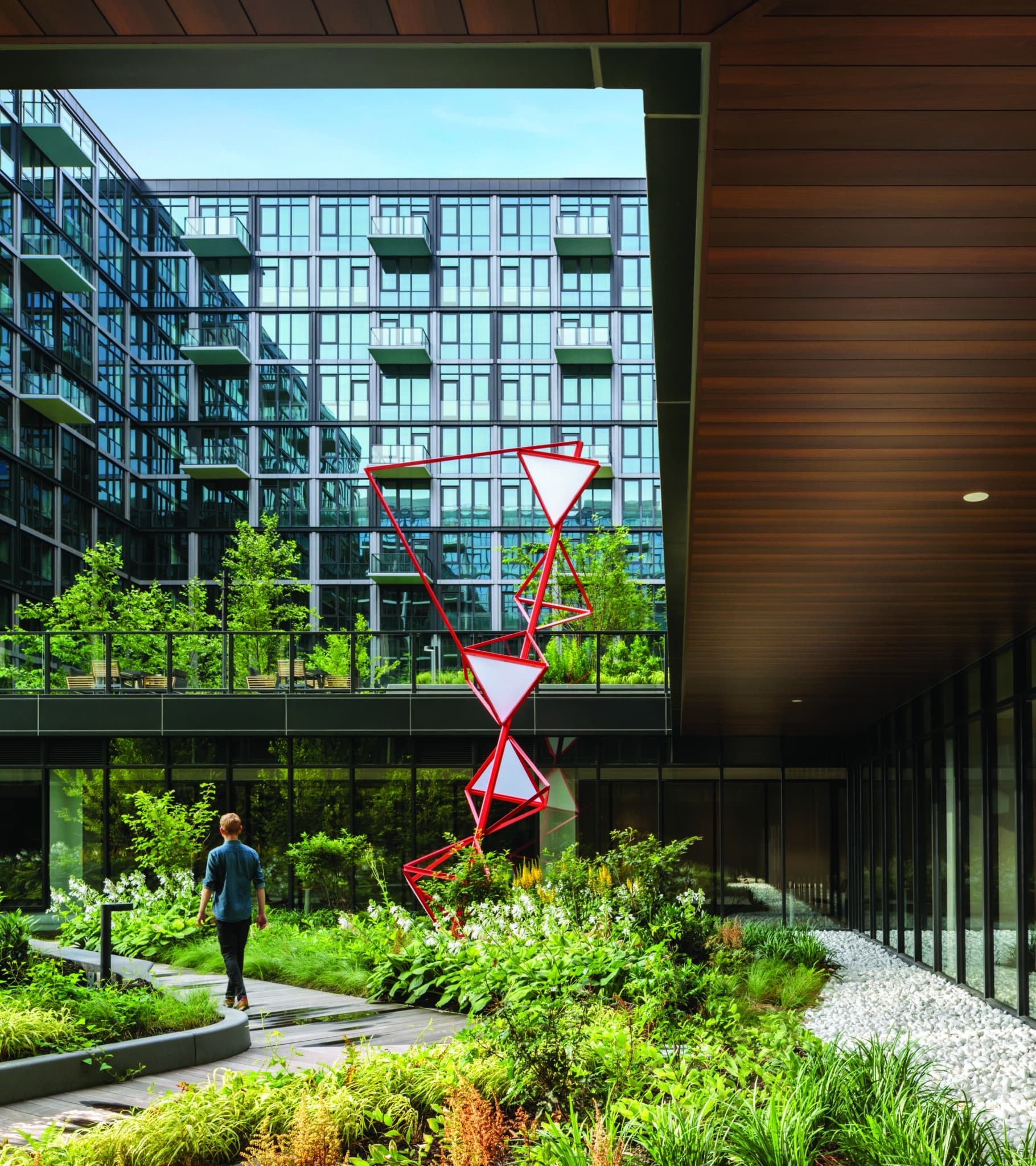 Amenities include rooftop lounges, co-working areas, a fitness center, an indoor basketball court, a children’s playroom, pet care facilities, a turfed dog run, and nearly one acre of landscaped outdoor space. At street level, the development enhances the pedestrian experience by activating retail frontages, improving the public realm, and providing convenient parking for residents and visitors.