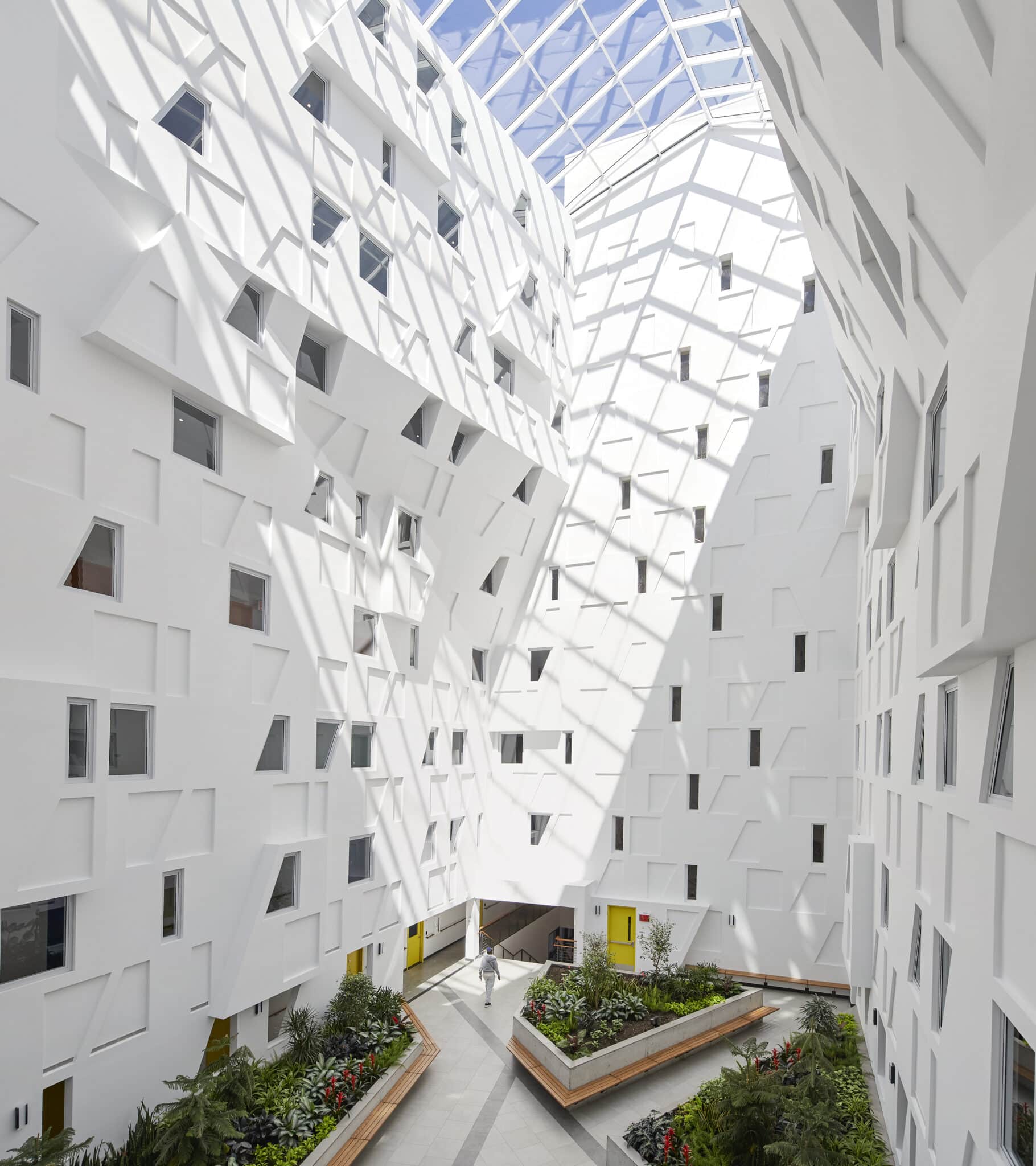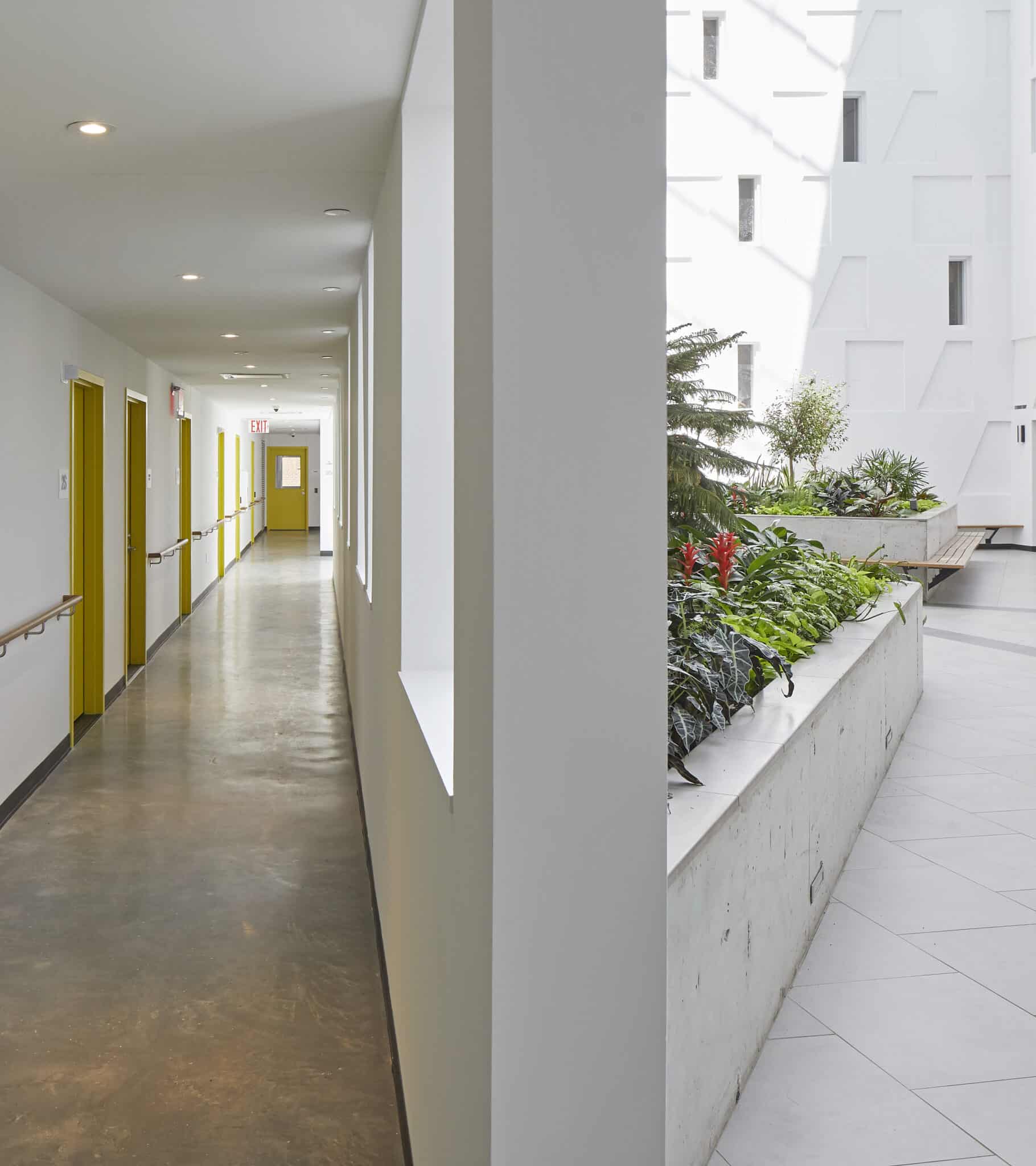 Following the Housing is Health, Health is Housing model, the Atrium at Sumner’s unique building design is centered on an interior garden where residents experience nature year-round. Designed by world-renowned architectural firm Studio Libeskind, the building is sited on formerly open space on the NYCHA Sumner Houses campus. As visible in the Skyline view image, the landscape design and building are thoughtfully incorporated into the campus plan.