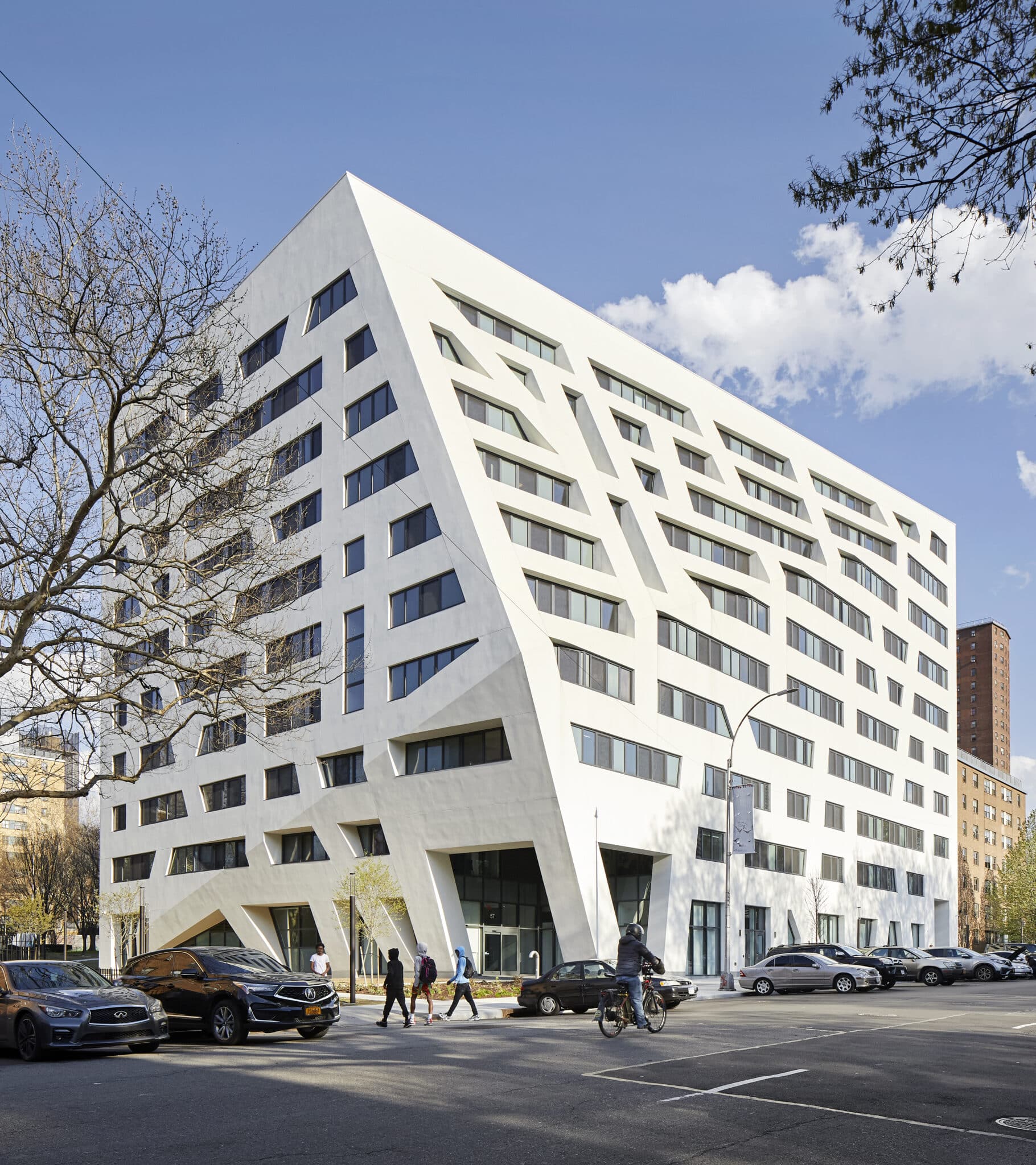 Developed for low-income older adults age 62 and above, the building has a total of 190 apartments: a mix of one bedroom and studio units with a two-bedroom apartment for the live-in resident manager. Social Services are provided on-site to all residents through Selfhelp’s Housing with Services model (SHASAM), with comprehensive case management services provided to the formerly homeless residents for whom 30% of the units were set-aside. Resident amenities include a library with computer area, gym, a multipurpose community room equipped for multi-media events, low-cost wifi and a lobby space with monumental stair to garden level. Resident bathrooms have roll-in showers and an emergency pull cord system, both designed to help residents age in place.