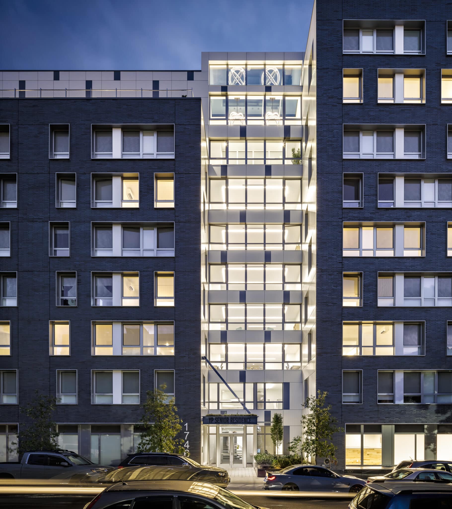 YP Senior Residence is a 9-story, LEED Platinum certified development that brings 117 units of affordable senior housing to the Bronx. Developed by Volunteers of America – Greater New York and co-developer Robert Sanborn Development, the building is designed to address the social needs of seniors, featuring supportive services and a network of flexible common areas. Amenities include a large community room, landscaped rear yard, lounges on most levels, 8th-floor double-height lounge and adjacent terrace, and laundry rooms on each floor. Sustainability features improve the building’s performance and enhance resident comfort, including VRF heat pumps, energy recovery ventilators, photovoltaic panels, and continuous stonewool exterior insulation. The building, designed by Magnusson Architecture and Planning, pays homage to the surrounding Art Deco structures with a recessed, courtyard style entry that preserves the street rhythm. While the dark masonry on the exterior is a contemporary take on the neighboring brick facades, white, silver, and gray metal panels lighten the building’s appearance. Glazing at the lounges breaks up the massing, creating two distinct volumes that fit the community’s scale.
