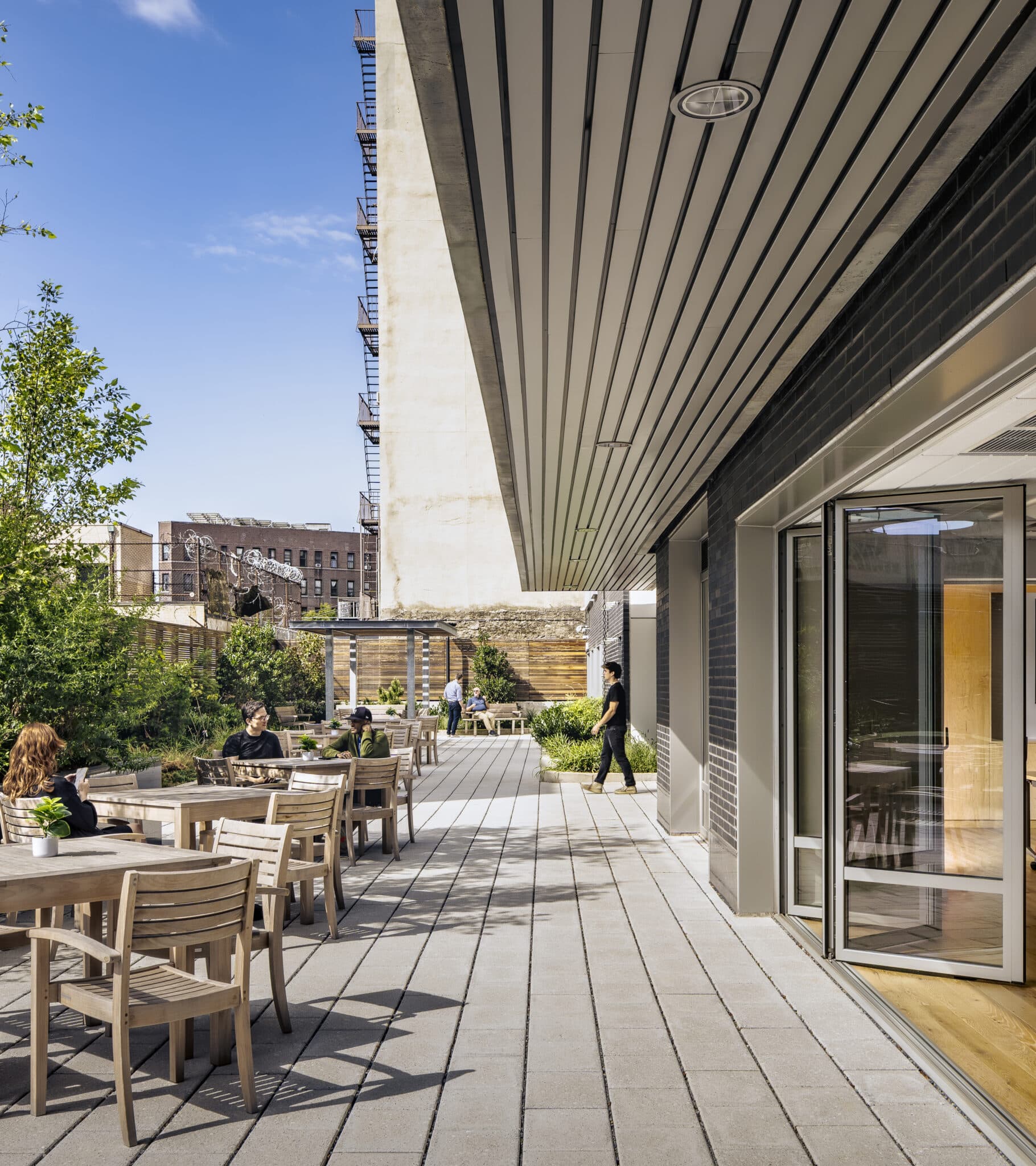 YP Senior Residence provides critical housing for low- and extremely low-income seniors, with 37 supportive units reserved for seniors experiencing chronic homelessness. Designed to address isolation, it features a network of indoor and outdoor gathering spaces. Sunny lounges welcome residents as they exit the elevator and provide convenient spaces to connect with neighbors, while the 8th-floor double-height lounge and terrace ensure that the building’s best views are accessible to all. At the cellar level, the rear yard functions as an extension of the adjacent community room, supporting programmatic flexibility. A large sliding wall can be opened to join the spaces, and features like moveable furniture and an interior partition can facilitate various social activities.